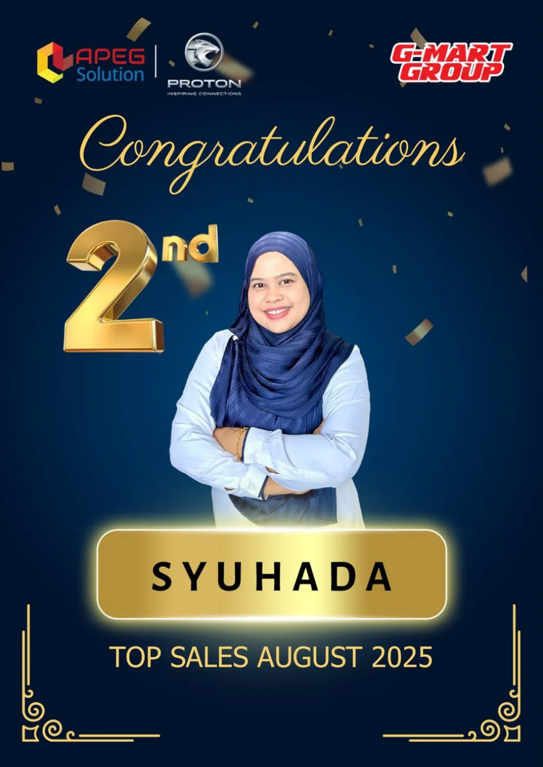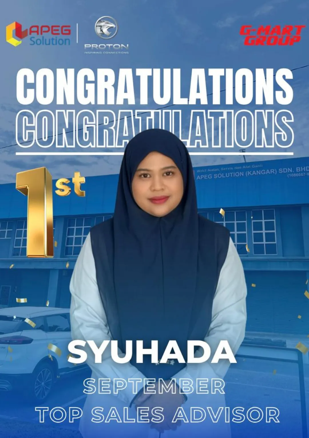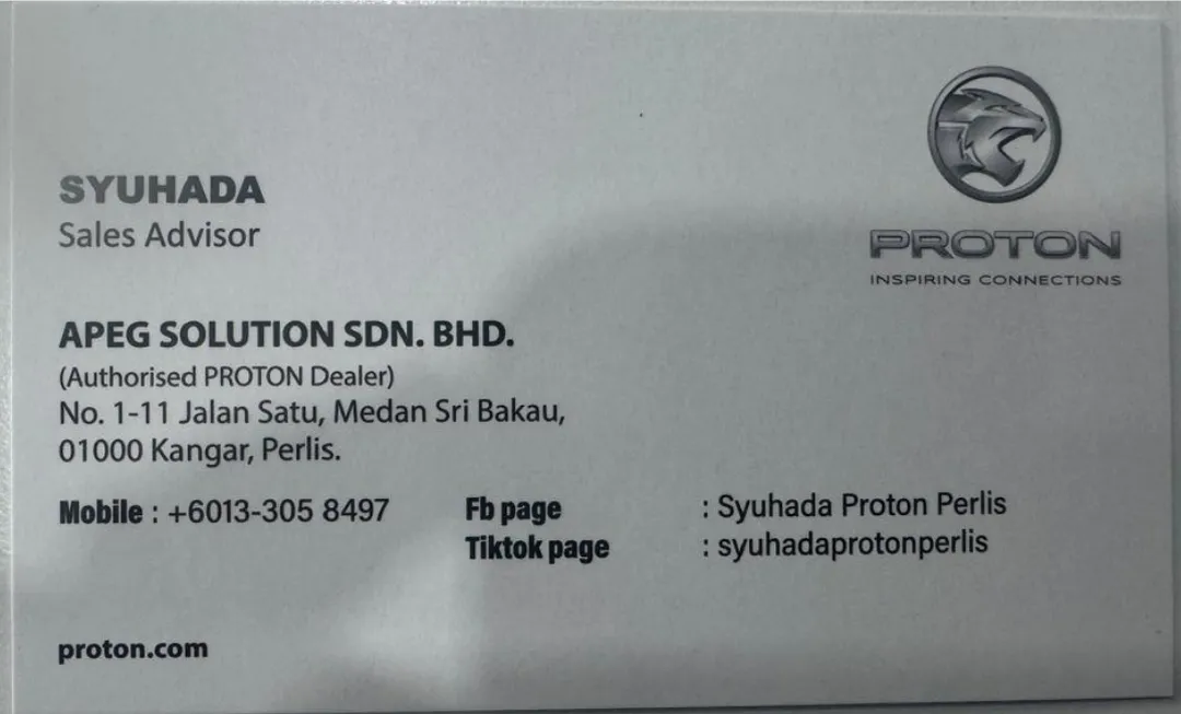 Hai! Nama saya Nurul Syuhada, Sales Advisor Proton Perlis yang sah. Berpengalaman lebih 5 tahun dalam bidang jualan kereta di Malaysia.